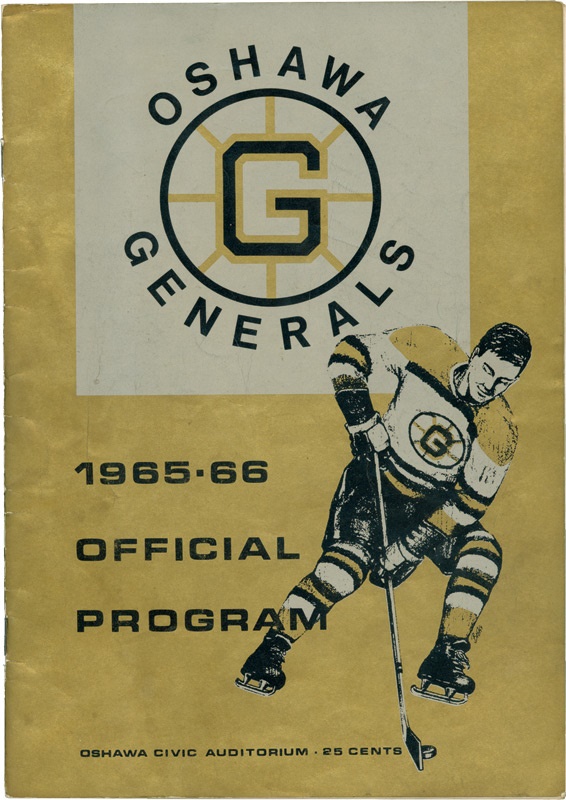 Great program from Orr's final year in the Junior League with the Oshawa Generals, when he led the Gens to the title before leaving for the big club in Boston. 40-page yearbook sold for 25 cents at the Civic Auditorium is a time capsule of small-town hockey with ads for local businesses, raffle prizes, and crewcut players like Orr -- one of whom, Wayne Cashman, would play with him for years with the Bruins. Cover has an illustrated skater against a gold background and the team's "G" logo at top center. Program is EX+ with light spinal damage and a rime of browning on the edges of the inside pages.