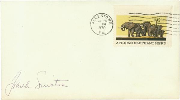 A Rat Pack would have been more appropriate, but an African Elephant Herd will have to do as the postage stamp on this 1st day cover signed by Old Blue Eyes. Envelope is postmarked June 24, 1970 and signed "Frank Sinatra" in black pen on the lower left hand corner. Signature is a nearly flawless 9/10 at the least, and the envelope and stamp EX-MT. Let's just call him Chairman of the Herd.
