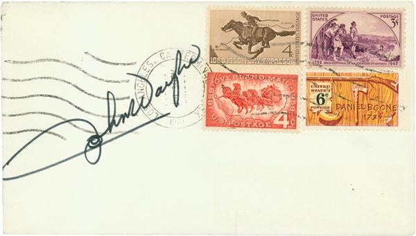 Now here's a perfect fit -- the Duke's treasured signature on 1st day cover featuring 4 Old West-related stamps: 1860-1960 Pony Express, Sesquicentennial Kentucky Statehood, 1858-1958 Overland Mail, and commemorative Daniel Boone. What, no Alamo? Signature in black marker is a nearly pristine 9/10 or better with a grand flourish to the "J". Envelope postmarked July 30, 1970 and is NRMT, stamps EX.
