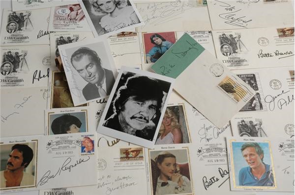 The royalty -- and racy gossip -- of Hollywood and its stars is brought home in this marvelous lot of 25 mostly 1st day covers with stamps and/or envelopes commemorating Tinsel Town's surreal aura. The amazing diversity here includes legendary actresses Bette Davis (2), Hedy Lamarr, Marlene Dietrich, Lillian Gish, June Allyson, Debbie Reynolds & Lauren Bacall all on D.W. Griffith covers (Another of these has Charles Bronson and wife Jill Ireland.). Burt Reynolds, Ava Gardner, John Travolta, Loni Anderson Alan Alda signed envelopes with their picture in silk cachet (another has Ali MacGraw's on a Steve McQueen envelope!). Also: Henry Fonda, Kirk Douglas, Joan Crawford, Peter Lawford, and small publicity photos signed by Jimmy Stewart and Bronson & Ireland. All items EX-MT and deserving of a cinch for the Best 1st Cover Collection Oscar.