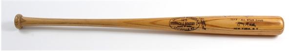 One can almost feel Morales' buttons popping in pride reading his inscription on the barrel of the personal model 1977 All Star Game bat he earned that season as a Chicago Cubs outfielder. The venue of the game offered a special thrill for the Puerto Rican native, who etched in blue marker his name and "1977 All-Star Game, Yankee Stadium" on the Louisville Slugger K75 lumber, though the bat's own engraving "1977 All Star Game, New York, N.Y." with his facsimile signature needs no embellishment. Morales used this good-as-gold memento only briefly, to christen it, thus it has just light use with a few nicks and markings, and shines with a smooth gloss.