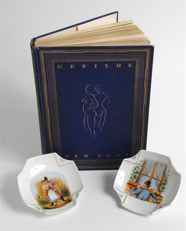 Vintage erotica in this 3-item collection from the 1930s. Centerpiece is the 351-page book "Gefilde Der Lust" (rough translation: "Garden of Desire"). Published in Germany in 1930, the large impressively bound volume is a panorama of erotic art and sexual mores around the world, with pages filled with illustrations including many color plates. Some of it is raw, some dainty, with accompanying German text that no doubt is very prim and proper, given that the subtitle touts a psychological study of sex. An important book is sexology, VG-EX with a slightly dislodged blue-gold front cover. Also two 5 x 5" ceramic plates apparently from Germany or Austria with tasteful hand-painted images, one of a soldier romancing a shy maiden and another of a mustachioed Peeping Tom. Plates NRMT with no chipping.
