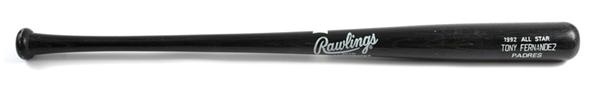 The Dominican Republic's all-time major league hits leader with 2,276 when he retired in 2001 (he's since been passed by ageless Julio Franco), the switch-hitting Fernandez put in 17 seasons mostly with Toronto and was regarded as arguably the game's best shortstop. Well deserving of regular All-Star honors, he used this custom bat in the '92 Midsummer Classic when he was a Padre. Black Adirondack 454B is imprinted in white with his name between "1992 All Star" and "Padres." "TF" is engraved in the knob with the model number. Good use with a few dings and a 3" strip of white tape midway up.