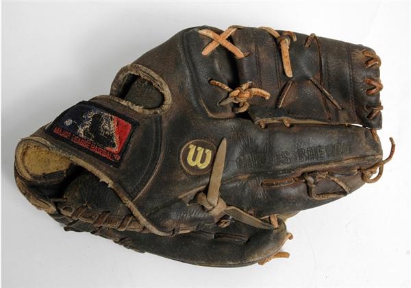 Ever wonder what a Gold Glove second sacker's mitt really looks like? The one used by Carlos Baerga in his first 4 seasons with the Indians (1990-93) looks less like a mitt than a mutt, the byproduct of Baerga using it apparently every single game during that skein. Dark brown Wilson mitt has been rubbed raw ans clean of most of its stampings, though the MLB logo on the wriststrap and "Carlos Baerga" embossed on the thumb are perfectly visible. Glove is surprisingly small, almost child-size, as are the mitts of most great infielders. Came from Baerga's nephew.