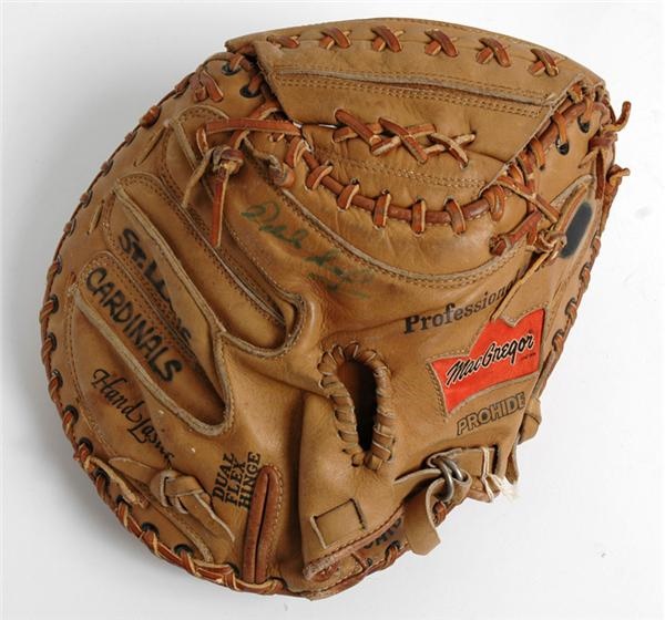Game used pancake mitt used by Cardinals backup catcher Orlanso Sanchez during the 1982 season. Macgregor PC2 Premium Prohide is as rugged as a bull's hide and is marked with Sanchez' name in green marker and "St. Louis Cardinals" in black marker on the back side. Splotch of black marker over a green marking as well. Laces are tight and the leather evenly darkened into a brownish gray. As tough a game-used big league mitt as there is.