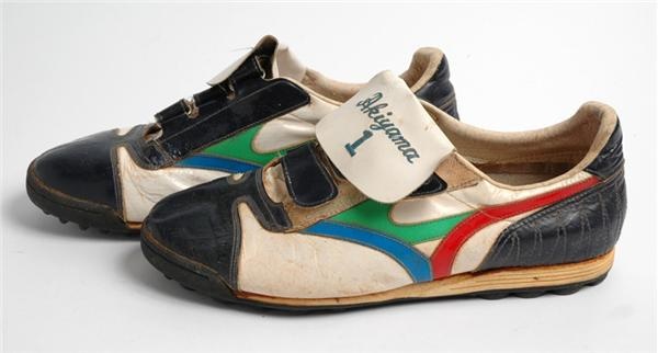 In the Land of the Rising Sun, these Mizunos are as valuable as Derek Jeter's spikes are here. They were worn by outfielder Koji Akiyama, the star of the Seibu Lions dynasty that won 6 out of 7 Japan Series titles from 1986-92, during the time he won yet another with the Fukuoka Daiei Hawks in 1999, their 1st since 1958. The colorful cleats have a large Velcro covering tongue embossed with "Akiyama 1" in green lettering. Cleats show good wear with some caked-on dirt on the undersides. Great shoes from one of Japan's all-timers.