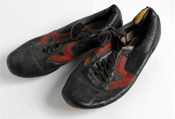 Bo Diaz put in a nice tidy 13-year career (1978-89) behind the plate for the Indians, Phillies and Reds. He hit .333 for Philly in the '83 WS against the Orioles. Diaz wore these low-cut cleats for some of that span, though they didn't make him any faster (he usually was near the top in grounding into DP's). Black size-10 Van's cleats with red "V" slashes have "6" handwritten into the inner heels and much caked-in dirt around the spikes.