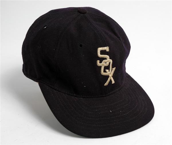 Classic White Sox cap circa 1963 was worn to the mound by one tough cookie, Puerto Rican fireballer Juan Pizarro, who in '62 threw two no-hitters and in '63 and '64 went a combined 35-17 with ERAs well under 3.00. Blue cap has the old-style diagonal "SOX" in white, and a handwritten "32" is on the underside of the bill. Extensive wear with abundant soil and sweat staining.