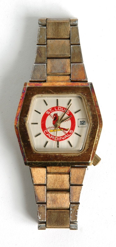 A lot of time has ticked by since this watch was presented to Bob Forsch to commemorate his May 16, 1978 no-hitter against the Phillies -- the 1st no-no by a Card pitcher since Jesse Haines in 1924. Forsch, who pitched more games for the team than anyone except HOFers Haines and Bob Gibson (and with his brother Ken are the only brothers to throw no-hitters), gave the watch to his teammates after the no no. He gave this one to Jerry Morales. Inner face has the Cardinals name and logo. Back is engraved "Bob Forsch, No-Hitter, 4-16-78." Clearly worn regularly, the stainless steel watch has lost some of its gold luster and has a rainbow-like mix of colors on the bezel. Overall VG-EX and still in perfect working condition.