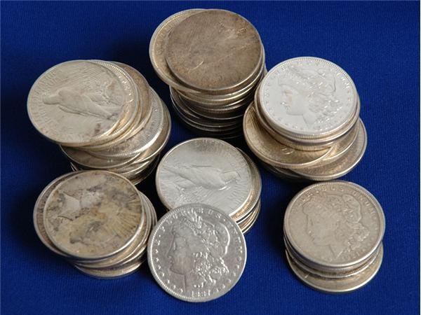 Silver dollar cache includes 25 pre-1900, 1 from 1901 and 25 from the 1920s. Oldest is from 1879. Motifs is nearly identical for all, with Lady Liberty on front and American eagle on verso, with subtle variations in design, with pre-1900 Lady Liberty looking faintly like a British queen; post 1900, her crown sprouts columns in a more Statue of Liberty motif. Coins are G-VG, some EX+, with tarnish and erosion of upraised images on several in all vintages. Collectors will be able to pinpoint specific traits that increase the value of a good many of these beauties.