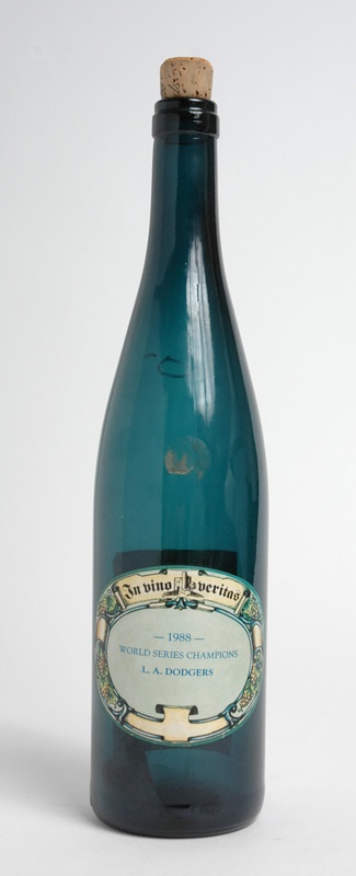 This bottle of Vino Veritas champagne wears a label reading "1988 World Series Champions, L.A. Dodgers", which explains why it's drained of its contents. Indeed, just thinking of a decrepit Kirk Gibson homering off Dennis Eckersley to win game one is an intoxicating feeling, recalling Jack Buck's call, "I don't believe what I just saw!" Green bottle has some adhesive damage and some of the cork is gone, but o/w VG-MT and a bubbly treat for Dodger buffs.