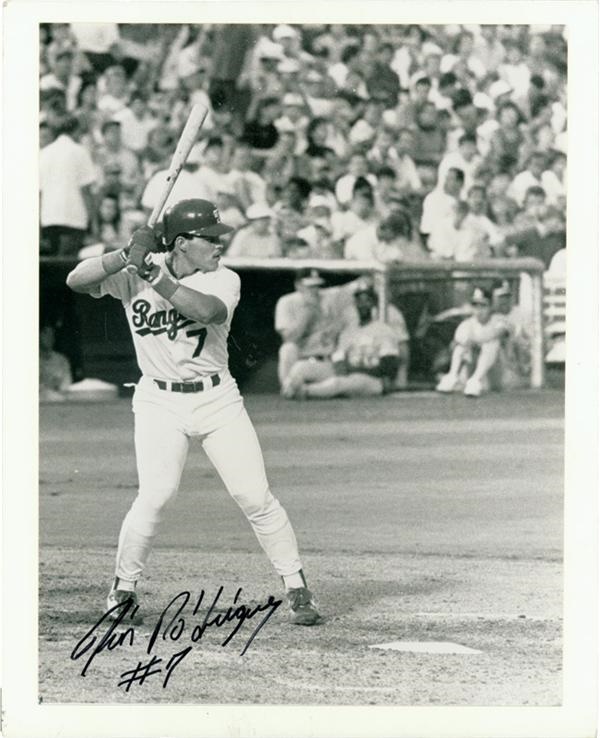 Super early 8 x 10 of I-Rod coiled in his batting stance back when he anchored the Texas Rangers, his crystal clear image fronting a hazy backdrop of Oakland A's players watching from the dugout and fans in the stands above. Photo is signed by Pudge in black marker with "#7" under his name. Great signature of the '99 AL and 2003 NLCS MVP, 9/10 at the least, and a reminder of the man's wiry power. Photo NRMT and mounted on cardboard.