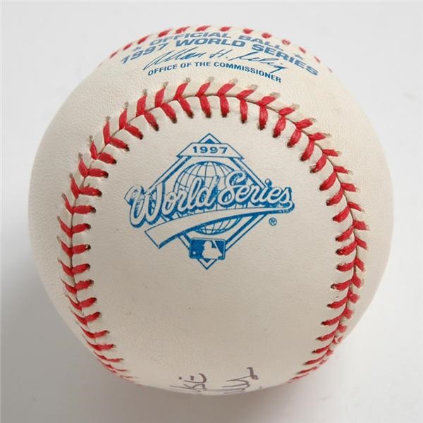 From coach Jerry Morales' vast collection of game-used balls comes this terrific horsehide batted around during the seven-game 1997 World Series between the Marlins and Indians. Morales signed his name with "1997 Game Use" on the sweet spot. Official WS ball is near pristine but with evident markings of use.