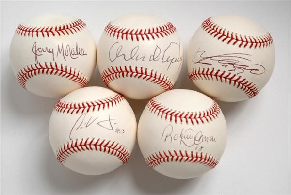 A quintet of singley signed Official MLB (Selig) baseballs distinguished by the signatures of some great Latin players including one HOFer (Orlando Cepeda), one probable future HOFer (Vladimir Guerrero), and one who seemed like a sure thing a few years back and who still may be (Roberto Alomar). The two others were signed by Jose Vidro and former big leaguer and Expo coach Jerry Morales, from whose collection the balls came. Signatures and balls NRMT overall.