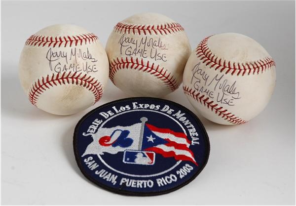 Sterling mementos from the Montreal Expos' 2003 series with players from the Puerto Rican baseball league, back when the Expos had a cozy relationship with the island, playing some regular-season games there (before the team found a new home in Washington D.C.). These 3 custom MLB balls with stampings from the series are signed by then-Expo 3B coach Jerry Morales, with the notation "Game Use" in blue pen. Also a red, white & blue patch from the series. Balls and patch EX-MT.
