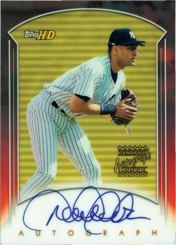 Jeter's 1999 Topps Autograph Issue HD card is an eye-popper, featuring the Yankee captain in an intense pose in the field awaiting a pitch and the signature beneath in blue Sharpie. Card has the Topps authentication hologram on the back under a torso-up shot of the Kalamazoo Kid. Card grades NRMT with the only conceivable flaw being the subtlest of dings on the upper left corner, though you may need a microscope to see it. Not an easy find in this good a condition at this price.