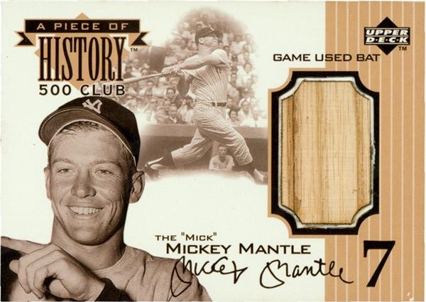 This Mantle card has all the other Micks -- even the '52 Bowman -- beat in one respect: it has an actual piece of a Mantle game-used bat embedded to the front of the card. From Upper Deck's 2002 "A Piece of History 500 Club" series. Front of card has images of the Mick swinging and a close-angle shot, and a facsimile signature under the sliver of wood which peaks through an opening on the right side. Card is a hot item and in this example is NRMT and a recent-vintage must-have Mantle.