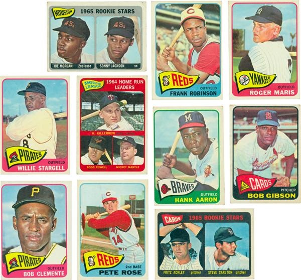 This group of 1965 Topps cards would make a nice start if one is thinking about beginning a 1965 Topps set. The grouping is pretty diverse, containing key rookies, superstar cards and high #'s. Highlights of the group include, 477 Carlton RC VG-EX, 377 Stargell NM+, 320 Gibson VG, 207 Rose EX-MT, 170 Aaron VG oc, 160 Clemente EX oc, 155 Maris VG-EX, 120 Robinson VG, 16 Morgan RC GD wrinkles, 3 HR leaders Mantle VG. Please note there is no regular issue Mantle card. The balance of the cards in the set grade 20% EX-MT, 20% EX, 20% VG-EX, and 40% VG or lesser.