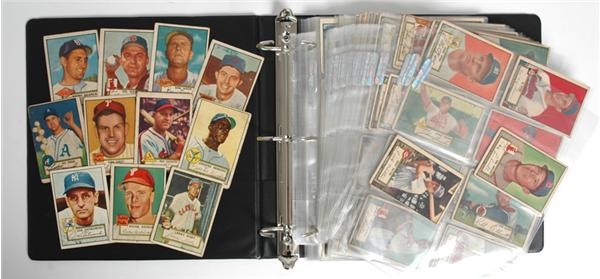 This is a great selection of affordable 1952 Topps cards, the group contains low #'s red and black backs, stars, Yankees, Dodgers, Hi #'s and pretty much a little of everything. Some of the highlights include # 31 Zernial GD, 59 Roberts VG, 65 Slaughter GD, 195 Minoso GD, 216 Ashburn VG (2 pin holes), 243 Doby GD, 274 Branca VG. Additional cards included are 4,6,9,10,14,17,19.,20,21,23,24,25,27,30,34,35,38,39,40 (2x),50,51,53,54,56,57,58,60,62,63,64,66,71,72,73,76,79,81,82,83,84,85,87,89,90,92,95,96,97,99,102,103,105,108,110,112,113,114,115,117,119,123,124,126,128,163,193,194,196,197,198,199,201,202,203,204,206,207,208,209,210,211,212,214,217,218,220,221,223,224,225,226,228,229,230,231,232,234,235,236,237,238,240,242,244,245,247,248,249,251,252,253,254,255,256,258,259,260,262,264,265,266,267,269,270,271,272,273,275,276,277,279,280,281,282,283,284,285,287,289,290,291,293,294,295,296,300,301,302,303,304,305, 306,307,308,309,310,322,323,324,341,383,387,388,389. The overall condition breakdown of this lot is 15% VG-EX, 45% VG and 40% lesser.