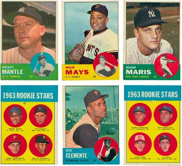 1963 Topps baseball set contains 574/576 cards. Near set is just lacking #160 and #340 Berra for completion. Highlights include #120 Maris (EX), 200 Mantle (EX), 300 Mays (VG-EX), 537 Rose rookie (“15” written in ink on the front o/w EX), 540 Clemente (VG-EX), 553 Stargell rookie (“18” written in ink on the front o/w EX). The other multi-rookie cards in the set all have a number written in ink on the front of the card. The near complete set averages VG-EX to EX with about 10% better/lesser.