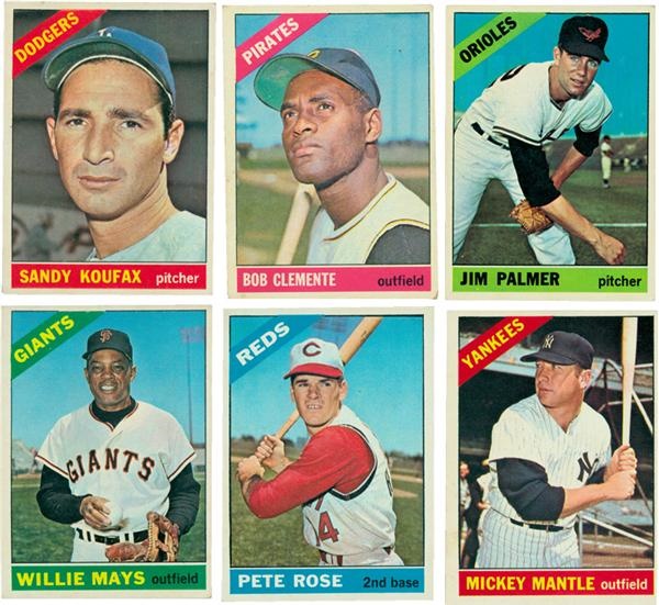 Near complete set contains 577/598 cards from the 1966 Topps baseball set. Most of the 21 cards that are missing are high numbers. Highlights include #1 Mays, 30 Rose, 50 Mantle (EX-MT, oc), 70, 100 Koufax, 110, 126 Palmer rookie, 288, 300 Clemente, 365 Maris, 500 Aaron, 526, 550 McCovey SP, 583, 598, and many other minor stars. Near complete set is 10% EX-MT, 60% EX, 25% VG-EX, and 5% lesser.