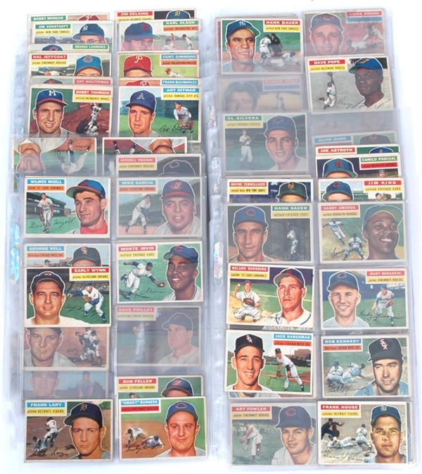 This lot will make the perfect start to a collectors grade 1956 Topps Set. Highlights of the group include 10 Spahn VG-EX, 15 Banks EX, 31 Aaron GD wrinkles, 25 Kluszewski EX-MT, 107 Mathews VG wrinkle, 164 Killebrew VG miscut, 120 Ashburn EX, 113 Rizzuto VG-EX, 240 Ford VG wrinkle, 101 Campanella GD-VG wrinkle. The additional cards included are as follows...1,3,10 Spahn,19,42,11,12,14,19,21,23,27,29,32,35,36,37,38,41,42,45,46,47,48, 50,56,62,64,65,66,67,68,69,73,74,78,80,86,88,89,90,96,98,99,100,103,106,112,115,117,118,119,125,128,132,137,139,140,141,142,143,144,147,148,151,152,154,155,158,159,160,162,163,165,167,173,175,177,180,181, 187, 191,192,193,194,195,200,205,208,209,210,220,222,228,229, 231,237,242,244,245,247,255,256,250,249,257,258,259,261,263,264,265,267,269,270,271,272,274,280,281,282,284,286,285,287,289,290,293,294,295,292,297,298,302,303,305,307,310,312,316,319,320,321,322,326,327,329,330,333,337,338,339,340. The condition of the balance of the lot is 10% EX-MT, 20% EX, 40% VG-EX and 30% VG or lesser.