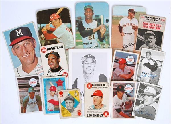 This collection contains cards from the mid 1950's up to the late 1980's. Some of the more notable cards included are 1969 Topps Deckle Edge Pete Rose GD stock loss to the reverse 33 Mays GD stock loss to the reverse, 1964 Baseball Scoops # 477 Babe Ruth GD, 1969 Kellogg’s # 7 Tom Seaver VG, 2 Rose GD, 1970 Kellogg’s # 22 Jackson NRMT, 1971 Kellogg’s # 65 Rose EX-MT, 1968 Game Card # 30 Pete Rose VG, 8 Mays EX-MT, 1964 Topps Giants # 31 Sphan GD, 1951 Topps Blue Backs # 43 Jones VG, 1971 Topps Supers # 32 Bench VG, and 56 Mays GD stock loss to the reverse, 1970 Topps Supers # 12 Clemente VG surface impressions and pen markings on the back. Additionally there are about 40 1971 Topps Supers mostly commons ranging in condition from GD to VG. There is a 1976 and 1977 Topps near complete sets. There are about 40 1970 Topps cards, a 1955 Topps card # 84. Furthermore one will find a few 1961 and 1963 Fleer cards, a signed 1989 Topps Ruben Sierra card. On top of that there are several starter 1970 Kellogg’s sets, they include sets from 1970,1971, 1974,1975,1976, one will also find an additional 49 Baseball Scoops cards ranging in condition from GD to VG about a dozen 1969 Topps Deckle Edge cards which are PR to VG, 20 additional 1966 Topps Rub offs which are VG to EX-MT. Lastly, there are 28 additional 1968 Topps Game cards. Overall this is a potpourri of baseball cards perfect for someone who collects for the pure love of the hobby.