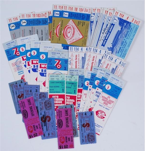 The "Big Red Machine" dominated the 70's by capturing World Series Titles in 1975 and 1976 after falling short in 1970 and 1972. Twenty Two (22) World Series ticket stubs, fourteen (14) NLCS ticket stubs, fifteen (15) Opening Day ticket stubs and a NRMT pair (2) of ticket stubs from The 1970 MLB All Star Game highlight this Reds treasure chest. Lot includes nine (9) various World Series/NLCS and Opening Day Programs (with lineups and boxscores written in). A MT 1970 All Star Game Program is included along with four (4) Indianapolis 500 Programs (1971-1974) and a ticket stub from the 1974 Indy 500. For the true Reds fan, this lot also contains a 1990 Reds World Champs t-shirt (size L and never worn), a pair of 1973 Reds Team 12" rulers,a 1970 mini felt pennant, two (2) "First Nighter" River Front Stadium Certificates and stubs from the first Game Raincheck at Riverfront Stadium. As a bonus for fans of Ohio Sports, two stubs from the Sept. 20, 1970 Raiders vs Bengals Game are also included.Lot also includes original newspaper articles commemorating above listed events. All ticket stubs in NRMT condition with the exception of 8 of the WS tix and 6 others on which the teams and scores were hand written in ball point pen.