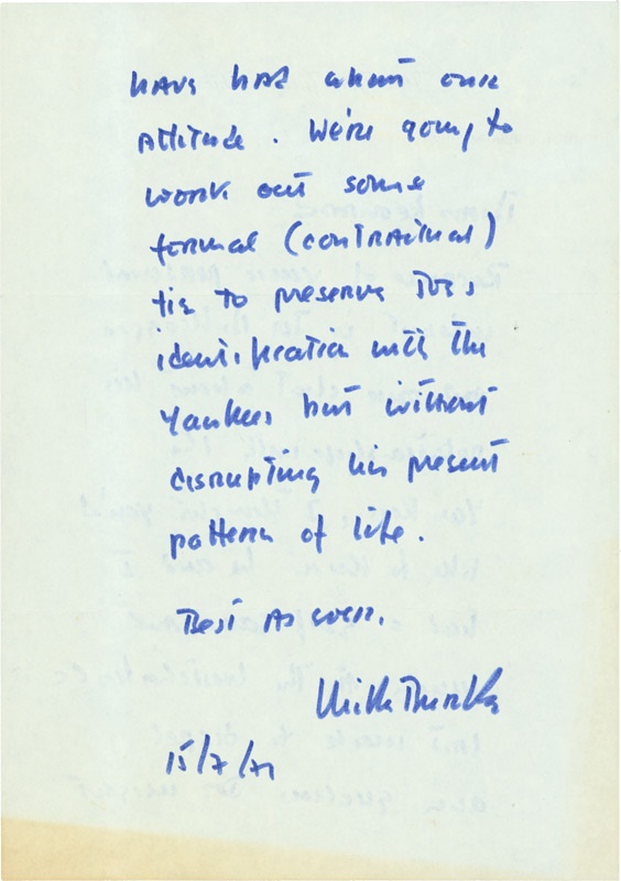 Former Yankee Owner (Managing Partner) Mike Burke discusses in this 1971 Joe DiMaggio's relationship with the Ball Club in the Bronx. The hand written letter was written to famed NYC columnist Leonard Lyons. The letter, written on official NY Yankees stationery is dated 7/15/71and is written in blue marker pen. The bottom border and left margin show age discoloration otherwise letter is MT.
