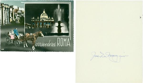 In a pilgrimage to the birth place of his ancestors, Italian American and Baseball immortal Joe DiMaggio writes to famed NYC Columnist Leonard Lyons about his trip to Italy on this vintage postcard. Written and signed in blue ball point. Lot also contains a Sympathy card for brother Vince which was also sent to Leonard Lyons and is signed " Joe DiMaggio" in blue ball point by Joe's sister. Rare pieces from the private life of Joe DiMaggio.