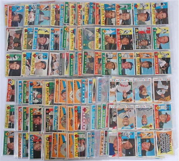 This lot of 350+ cards would make a nice beginning to a collectors grade 1960 Topps set. Highlights include 475 Drysdale, 480 Berra EX-MT, 10 Banks VG-EX oc, 35 Ford VG-EX, 73 Gibson VG-EX, 200 Mays VG-EX light surface impression, 250 Musial GD wrinkles, 295 Hodges VG-EX, 300 Aaron EX oc, 316 Mccovey VG, 326 Clemente VG+ oc, 332 Yankees Team Card VG, 343 Koufax GD, 350 Mantle VG-EX. The balance of the cards grade 15% EX-MT, 30% EX, 20% VG-EX, and 35% VG or below.