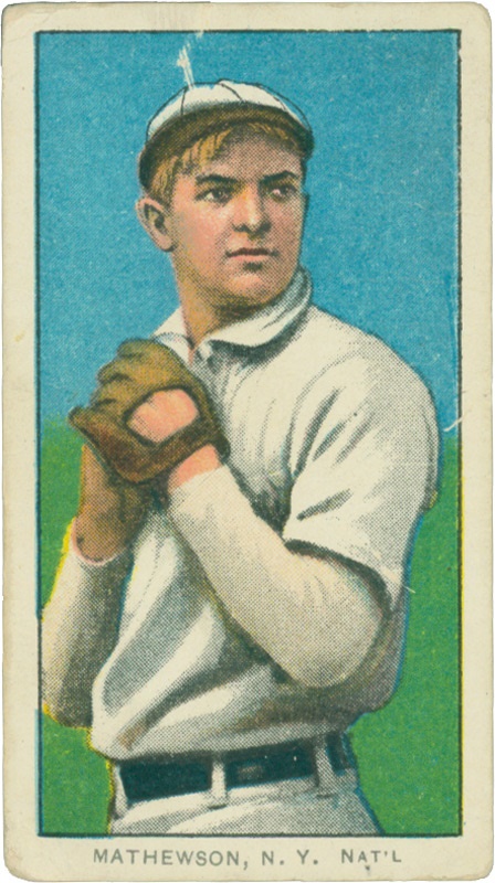 The card being offered in this lot is a T206 Mathewson White Cap variation. The White Cap is a more difficult pose than the dark cap. The front of the card has a tiny scuff just above the cap, and has minor corner wear. The reverse of the card has some stock loss, which is about the size of a dime. On a positive note, the card is well centered and exhibits excellent focus and vivid coloring.
