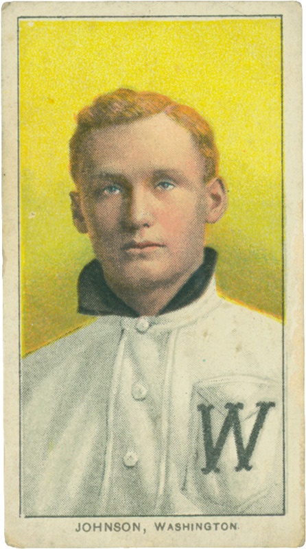 This offering is a T206 Walter Johnson portrait card. It is well centered and has minimal corner wear. The card is crease free and on the front appears to be a VG-EX card. Unfortunatly, the reverse has stock loss about the size of a quarter. The overall grade is GD