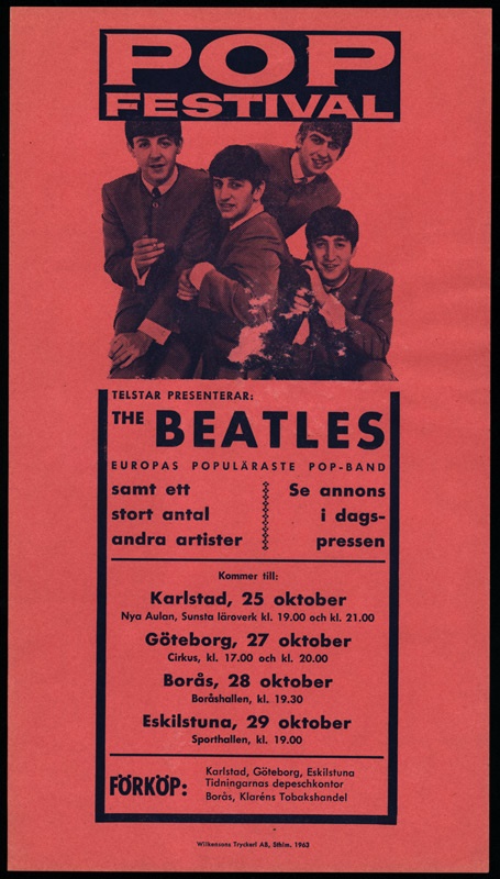 Magnificent handbill with a crisp and clean image of the Fab Four, promoting the four different venues and cities the Beatles played in Sweden on October 25 thru 29, 1963. “Pop Festival” handbill is dated 1963, measures 11.5x6.25” and is in NRMT to MINT condition. Obtained from the person in Eskilstuna, Sweden employed to distribute promotional material for the Beatles tour dates.