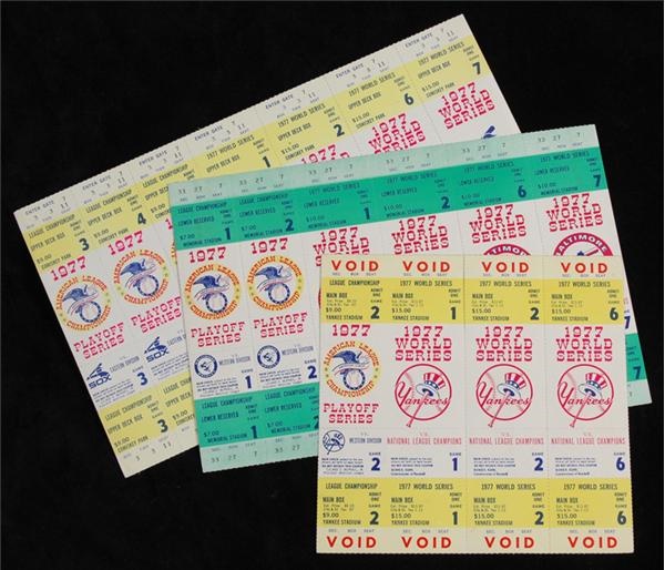 Unused and uncut ticket sheets from the 1977 ALCS and WS includes Yankee Stadium Game 1, 2 and 6 tickets -- the last game, of course, being the Yankee clincher against the Dodgers that saw Reggie blast homers on the first pitch his first 3 times up. Main Box tickets are stamped Void, as is the 4th ticket on the sheet, from the ALCS. Two other 6-ticket sheets include 4 more ALCS tickets and "phantom" WS tickets printed in vain by the White Sox (4) and Orioles (4). All tickets VG-MT.