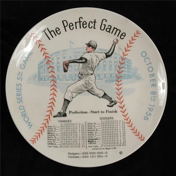 The Yankee right-hander served the Brooklyn Dodgers their lunch in Game Five of the Series, but not on a plate as nice as this. Souvenir, which is vintage but not made in 1956, is packed full of zeroes in the box score and stats for the Bums' line-up. Image of Larsen at top; Yankee Stadium at bottom. No maker's mark on bottom. NRMT. There are two versions of this plate; this is the far rarer "first" edition.