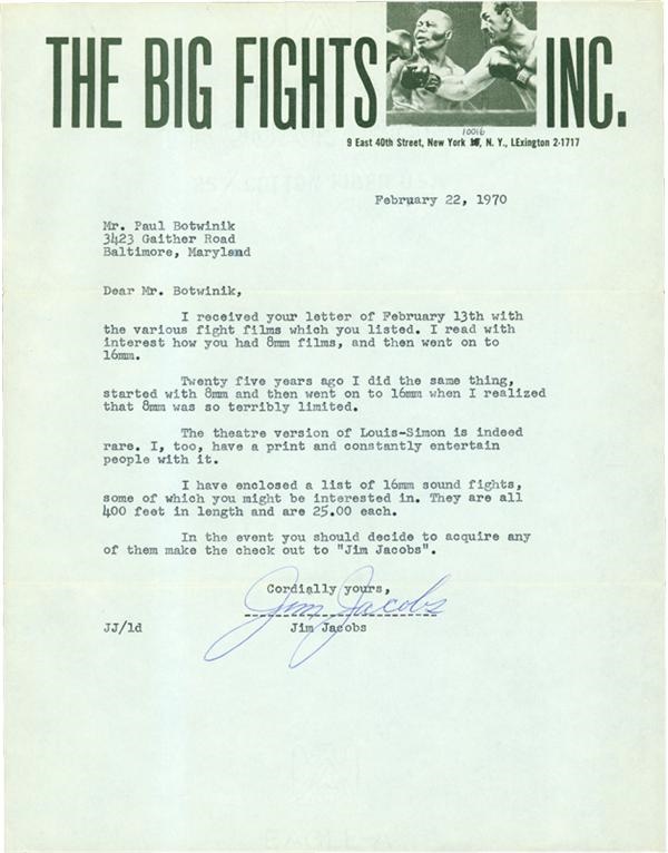 Jim Jacobs was best known as the co-manager of former heavyweight Champion Mike Tyson along with Bill Cayton. What few people in the main stream realize is that Jacobs was also a 22-time U.S. four- wall handball champion and was considered by experts to be "The Babe Ruth" of that sport. Jacobs along with Bill Cayton also managed triple champion Wifredo Benitez and former lightweight champion, Edwin Rosario. A noted Boxing historian, he along with Cayton, owned over 17,000 fight films dating back to the late 1800's. This lot of 24 letters (22 signed by Jim Jacobs) was compiled by a fight film collector who corresponded with Jacobs from 1970-1980. Six (6) of the letters are signed "Jim Jacobs" in blue or black ball point ink. Sixteen of the letters are signed "Jim" in blue, black or green ball point ink. All signatures rate 9 of 10.