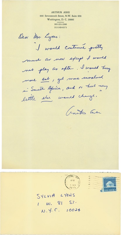 Handwritten letter by Arhur Ashe is undated but the accompanying envelope is postmarked September 3, 1975 -- only weeks after he'd won at Wiblemdon and attained #1 ranking in the world. Sent to N.Y. Post columnist Leonard Lyons' wife Sylvia, relating his future plans to "buy more art [and] get more involved in South Africa." Ashe, of course, had led a tennis boycott of that country for its apartheid policy. His 1993 death from AIDS was one of the sports' great tragedies. Letter on Ashe's personal Washington D.C. stationery written in blue marker with a NRMT signature. 7.25 x 10.5" and NRMT w/2 light folds.