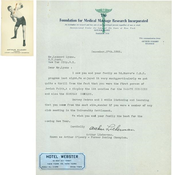 Cross-section of letters written by the following celebs to N.Y. Post sports columnist Leonard Lyons: Sid Luckman, Sept. 26, 1969, on vintage Chicago Bears letterhead, which came with freebie tickets to a Bears-Giants game). 2) Two by Jets owner Sonny Werblin, Nov. 22, 1967 & Nov. 18, 1969, one on Werblin letterhead, one of Jets letterhead, both typed in green. 3) Col. Barney Oldfield re an African safari, on blue Keekorok Ldoge stationery. 4) former jr. lightweight champ Arthur O'Leary (signed w/real name "Arthur Lieberman") on letterhead of his massage/chiropractic practice w/business card & oldtime photo. Others signed only w/first names. Oldfield letter G with tearing, O'Leary EX, other three EX-MT.