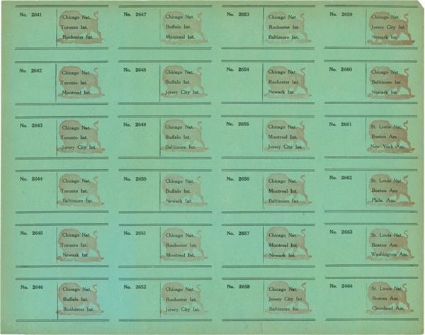 Once, fan betting was an accepted form of leisure activity, which nearly destroyed the game in its early days. This rare 11"x14" sheet is comprised of twenty-four uncut wager tickets (No.2641-2664), each with the light brown image of the Buffalo IL team under the prtined names of 3 teams from the NL, AL and IL, listed as "Boston Am" or "Rochester Int.", etc. Light discoloration around the edges and minor corner wear, EX. Wonder if Charlie Hustle is interested.