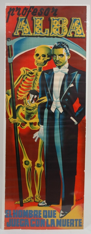The spooky original 1940s poster for the Spanish movie "The Man Who Played With Death" featuring magician Professor Alba and his bony friend that is being offered elsewhere in this auction is offered here in a life-sized (27 x 75") version mounted on thick cardboard stock -- creating an image so large and scary that you can almost feel the lure of the Professor's hard staring eyes. So if you start uncontrollably clucking like a chicken, you'll know why. Poster VG-EX with some small blips of paper loss along the edges and on crease lines in the top center and the right side. Image has top and bottom halves pieced together in the middle, creating a seam that can only be seen on close inspection. Boo!