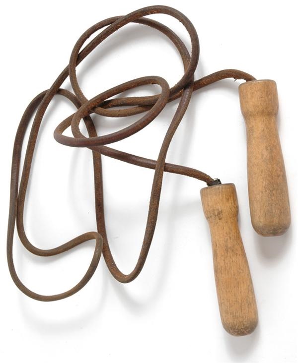 The top middleweight contender during the 1960’s, Rubin Carter was convicted of murder and sentenced to life in prison before he ever got the chance at a title. It wasn’t until 1985 that Carter was freed from jail after a judge ruled that he did not receive a fair trial. The story of “Hurricane” Carter is a controversial one, and his legacy is still debated in boxing circles to this day. This brown leather jump rope with wooden handles traveled with him daily to the Market Street Gym. Shows tremendous use and due to being stored, would benefit from a light cleaning. The offered jump rope comes directly from Carter’s son.