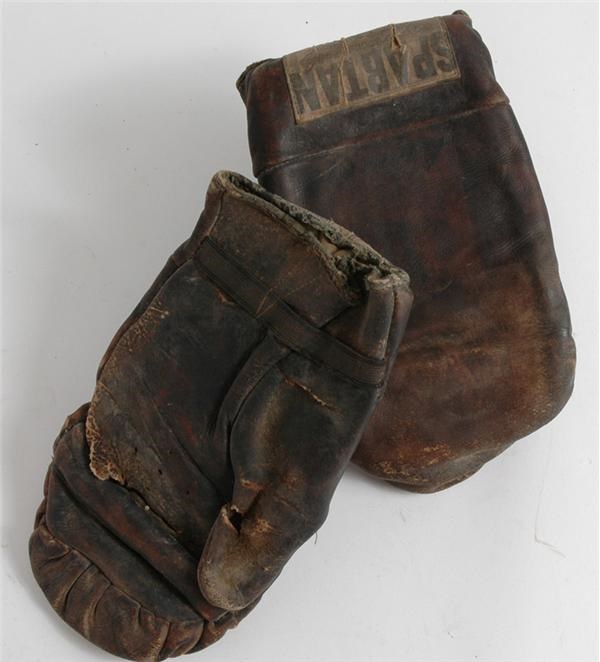 The top middleweight contender during the 1960’s, Rubin Carter was convicted of murder and sentenced to life in prison before he ever got the chance at a title. It wasn’t until 1985 that Carter was freed from jail after a judge ruled that he did not receive a fair trial. The story of “Hurricane” Carter is a controversial one, and his legacy is still debated in boxing circles to this day. This pair of brown, leather “Spartan” heavy bag training gloves traveled with him daily to the Market Street Gym. The leather is dry and cracked on the palm with a small hole in each thumb. Shows tremendous use and due to being stored, would benefit from a light cleaning. They came directly from Carter’s son.