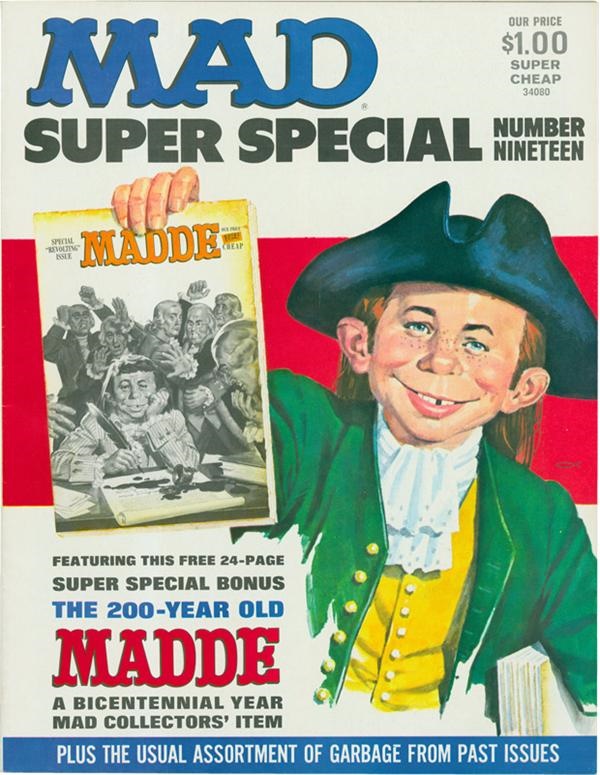Stunningly good MAD Super Special 19 -- a GEM MINT File Copy complete with original 24-pg "collector's " insert "Madde Special Revolting Issue" transporting Alfred E. Neuman back to the Revolutionary War. Material from 1972 & 1976 including devastating put-downs of the Mary Tyler Moore Show ("Mary Tailor-Made Show"), Howard Cosell, celebrity greeting cards, and sports fans ("Athletic Supporter Department"). Not a speck or wrinkle on cover or inside pages -- don't be fooled by the browning on "Madde"; it was done for effect. Spine is drum-tight. Classic Alfred on cover in Colonial garb holding up the "Madde" insert. Also note: Address is slyly printed as 485 MADison Avenue. You're mad if you don't grab this one. :