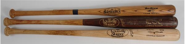 It was just the sort of abuse left on these 3 earthy pieces of lumber that made the guys who swung them no-doubt All Stars. Big hitters all, these personal model big boys were carried into the batter's box by and bear the names of Ron Cey (a 6-time All-Star), Chili Davis (3-time) and Gary Gaetti (2-time). Cey -- Adirondack Big Stick (33.5"), 10" crack on the handle, #10 written on knob. Davis -- LS I13 (34.5"), 2 cracks up the handle, #15 written on knob. Gaetti -- LS M158 (34"), uncracked, #8 written on knob. All have a ton of ball and cleat marks and pine tar residue.