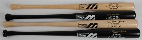 These 4 unused Rose bats are signed by the Hit King himself. A reminder of his fabled march to the hit record are the numbers printed under his real and facsimile signatures on the barrel, with bats produced upon passing each milestone and stamped PR 3631, PR 4000 and PR 4192 (after smashing Cobb's old record), while the 4th bat reads ATHL. First two bats are blonde and signed in black Sharpie, grading 8/10's. Other two are black and signed in gold Sharpie with a tad stronger ink flow grading 9/10s. Fabulous display appeal.