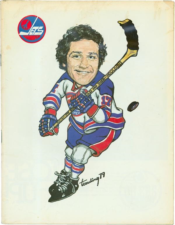May 16, 1979 Winnipeg Jets program for a game against Wayne Gretzky's Edmonton Oilers marks the last WHA game before the NHL merger. Great nostalgia piece for WHA collectors features a caricature of left winger Bill Lesuk and the team logo on the cover. 64 pages with lots of pictures of frizzy-haired players and stats. VG-EX with a portion of the upper right corner torn on the cover and scattered soiling.