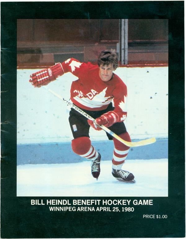 The 1st page of this program for the Bill Heindl Benefit Hockey Game played at the Winnipieg Arena on April 25, 1980 reads "A Hockey Happening" -- and in retrospect, it sure was, as this was the only time Bobby Orr (who's pictured on the cover) and Wayne Gretzky ever played on the same team, the NHL Pro Stars, who skated against the Canadian National team. Rosters of the teams in centerfold. Program NRMT.