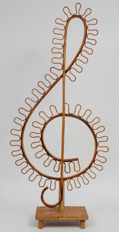 The perfect prop if Manute Bol ever plays Prof. Henry Higgins in "The Music Man", this towering 45" high G-Clef is mounted to an 8.5 x 11" bamboo base which has 4 legs each 2" high. Amazing detail work in the finishing of the light and dark brown bamboo, the solid-state squiggly pattern attached to the frame, and the bending of the clef into semicircular arcs, with the lower part molded into a U-shape. A conversation piece, to say the least, that would be ideal for music rooms and the exhibits of "really big" music collectors.