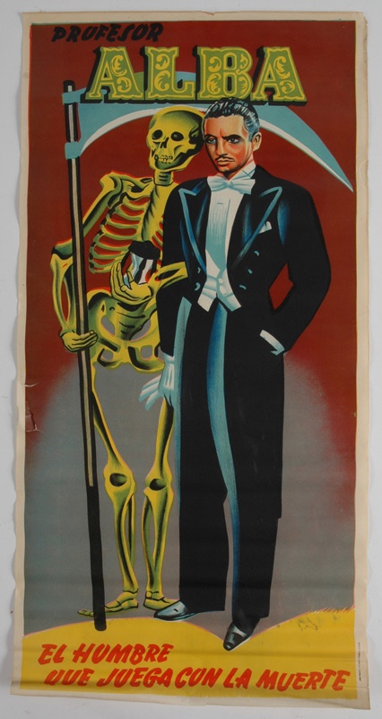 Spooky original 1940s poster for the Spanish movie "The Man Who Played With Death" featuring Professor Alba, a popular magician of the times, who in his natty tux seems not a bit fazed standing next to a skeleton holding a scythe of death. 13 x 26", full color, on delicate rice paper. Deep brown background with bright greens and yellows. VG-EX with some serrating along the edges and light soiling on the bottom yellow part and slight paper loss on the upper right corner, which can be rectified by framing or mounting.